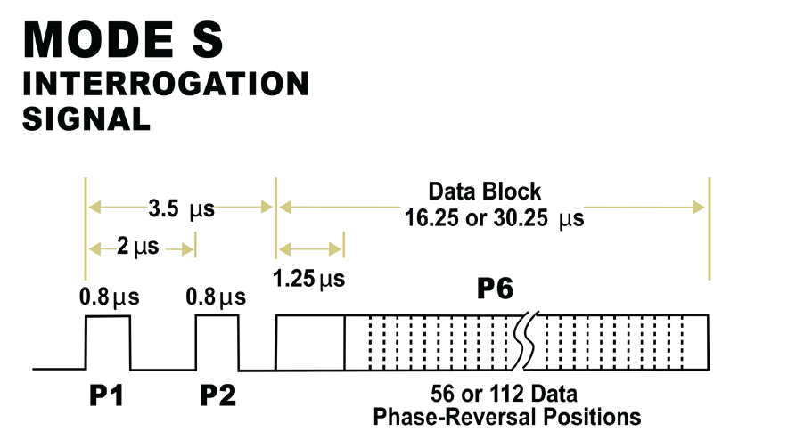 圖 3:模式 S 在脈衝 P1 與 P3 之間具有 3.5 μs 的時間間隔,並包含前導碼和相位調變資料區塊。