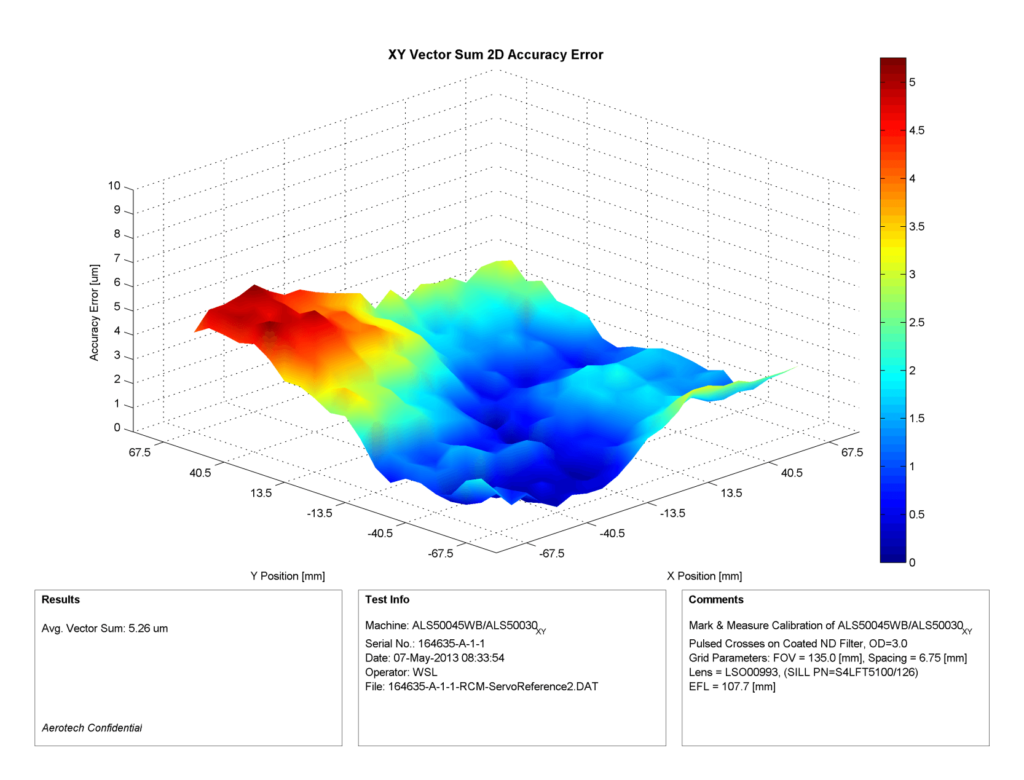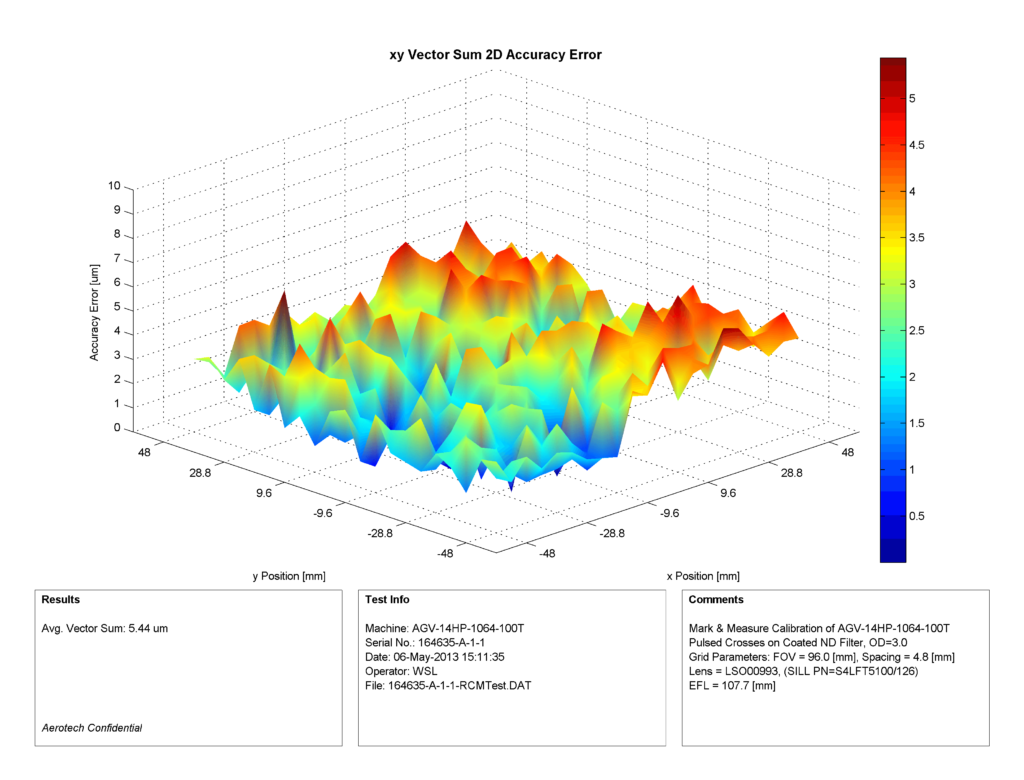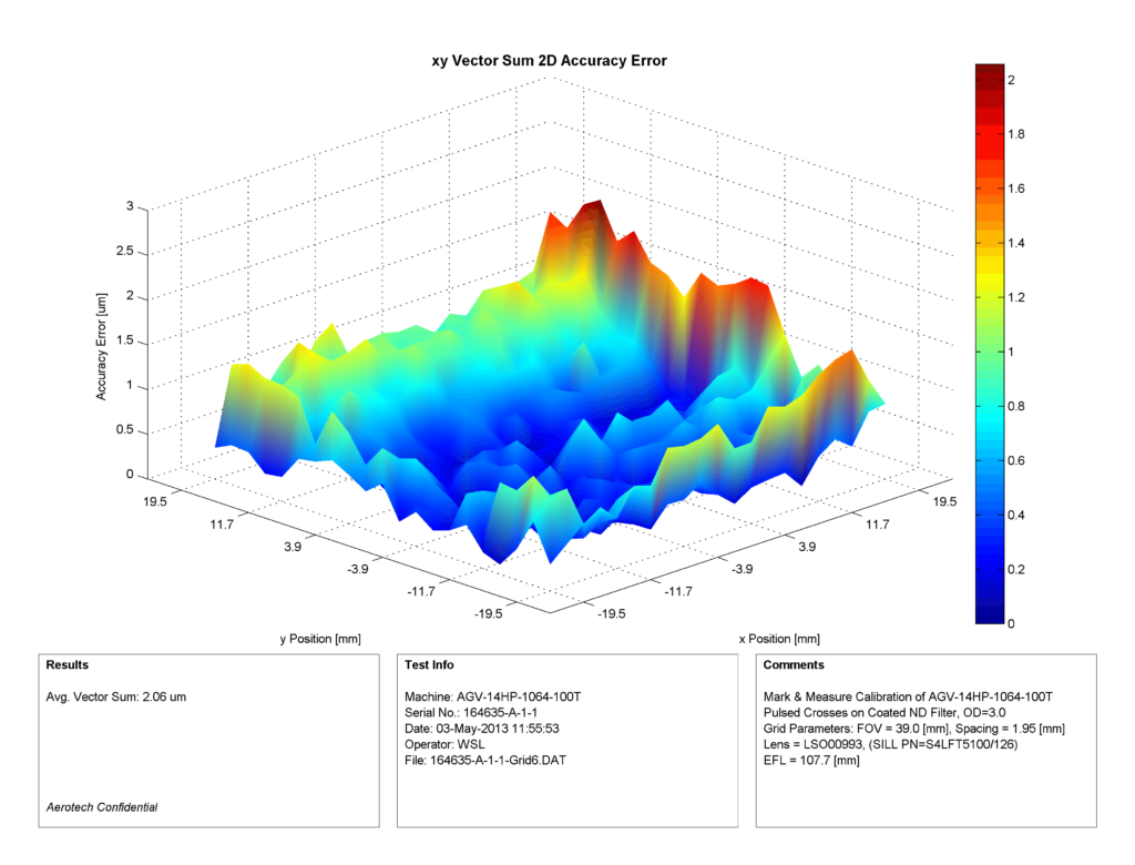 振鏡本身則是採用「標記與量測」技術進行校準,此技術使用紅外光雷射(1070nm 波長)在鍍銀玻璃基板上進行標記,隨後在高倍率下精密量測這些標記的位置,並將標記的實際位置與其預期位置之間的誤差,透過迭代運算方式,產生一系列校正表,最終校準後的誤差結果如下所示(向量誤差為 2.06 微米)。