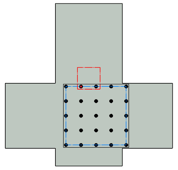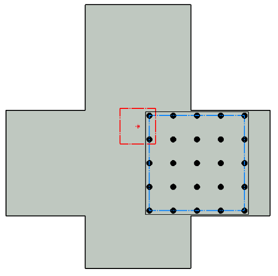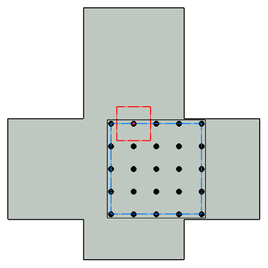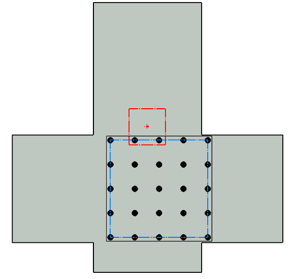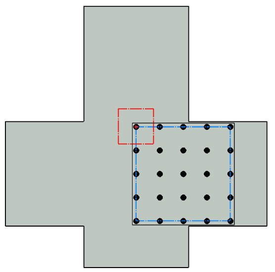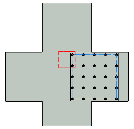 接下來的一系列圖示,重點在展示如何透過結合伺服軸座標系與振鏡掃描儀座標系的運動,來創建「隨機組合運動網格」,這些圖示呈現了伺服軸的移動、振鏡軸的視野範圍,以及由隨機組合運動測試程式實際標記的網格之相對位置,灰色外框代表平台組件,黑色方塊代表(由上方平台軸承載的)標記基板,黑點則代表待標記的網格,網格的整體尺寸,即藍色虛線方塊,等於伺服平台的總行程減去振鏡的總視野範圍(在我們的測試案例中為 96.0 x 96.0 [mm]),紅色虛線方塊代表掃描儀的總視野範圍,此處為 39.0 x 39.0 [mm],而位於 AGV 視野內的紅點則代表雷射光斑的位置。
