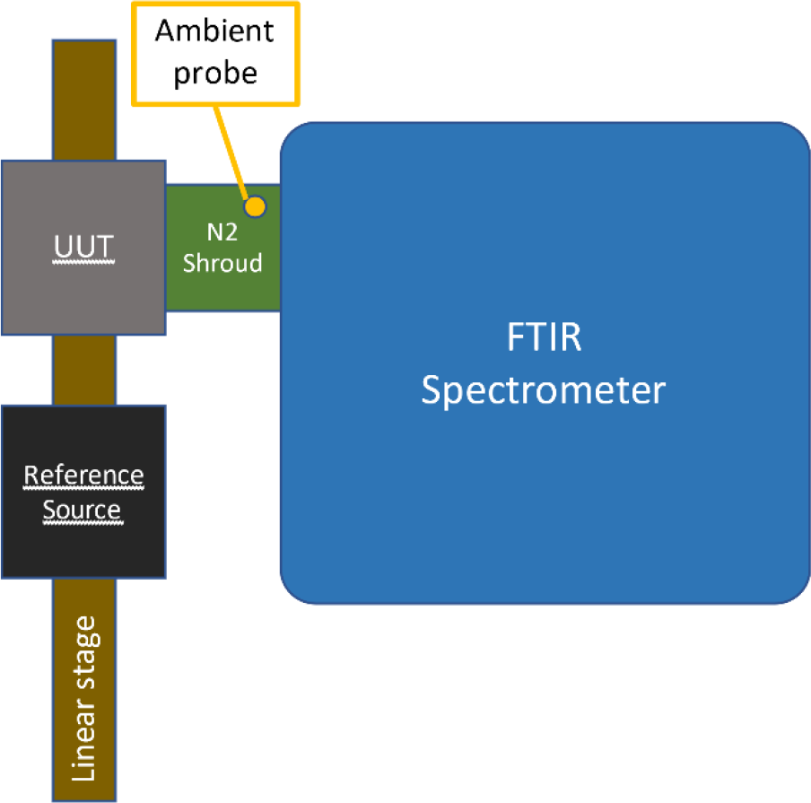 圖1展示了此輻射校準測試站的示意圖,其中,可追溯至NIST標準的參考黑體源與待測黑體單元 (UUT) 被安裝在一個線性移動平台上,該平台能夠精確地在這兩個位置之間進行自動切換;在FTIR光譜儀與被測黑體之間,設置了一個柔性遮罩,用於向該光路空間內充填乾燥的氣態氮氣,以有效減少由二氧化碳 (CO2) 和水蒸氣引起的大氣吸收效應;FTIR光譜儀本身也採用氮氣吹掃 (nitrogen purge) 的方式來達到相同的目的,即最大限度地降低環境氣體對紅外光譜量測的干擾。