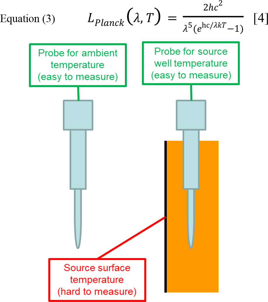 - L_Planck(λ,T_Ambient) 是在環境溫度T_Ambient下,根據普朗克定律計算出的理想黑體光譜輻射亮度。