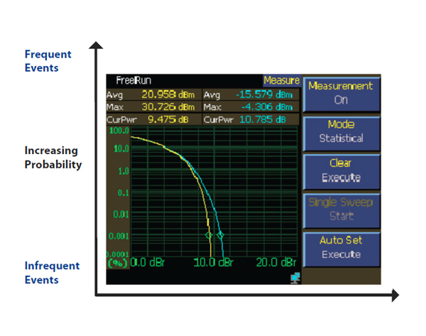 對於具有高波峰因數的低振幅通訊訊號,儘管在考量位元錯誤率 (BER, Bit Error Rate) 時相當重要,但其對於系統損壞的潛在風險更令人擔憂;與大功率峰值相關的高電壓可能在發射器系統中產生快閃或持續電弧,進而損毀元件,統計學是量測這些罕見事件的重要工具,瞬時功率值會依照大小而非出現時間進行排序,並且進行計數而非平均,此過程可以持續很長時間,僅受限於可用記憶體,或者在應用抽樣處理後可以無限期運行,這是一種評估事件的寶貴方法,例如:OFDM 訊號可能每天僅出現一次的最大峰值功率,運用統計資料擷取脈衝資料,可以提供在擷取振幅對時間量測時不易觀察到的額外洞察。