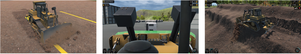 透過虛擬實境 (VR) 技術,此推土機模擬器為學員打造了沉浸式的訓練環境,不僅能從駕駛員視角(中圖)感受真實操作,也能從外部觀察推土機在各種地形(如左圖、右圖所示)的動態與作業效果,強化空間感知與操作預判能力。