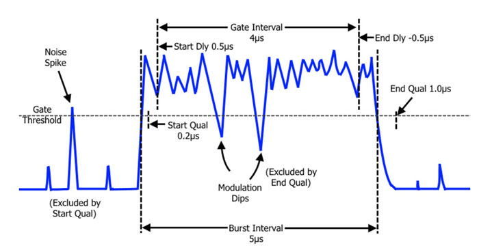 在擷取所需封包區段的量測資料之前,必須採取預防措施,以消除由偽觸發 (false triggers) 所導致的結果偏差;錯誤的觸發在描述 Wi-Fi 6 訊號特性時尤其需要關注,因為其調變方式在時域上呈現出類似雜訊的行為;如下方的圖 2 所示,一個短暫的雜訊突波超過了閘控閾值 (gate threshold),這可能導致在期望的閘控區間 (gate interval) 之外過早啟動量測,從而產生不準確的結果;為了防止隨機雜訊突波的干擾,使用者可以在 RTP 量測緩衝模式應用程式中定義一個稱為「啟動限定條件 (start qualifier)」的參數,此啟動限定條件定義了一個時間區間,訊號必須在此區間內持續高於閘控閾值,量測才能開始,這意味著短暫的雜訊突波或異常現象將因未能滿足此限定要求而被忽略。