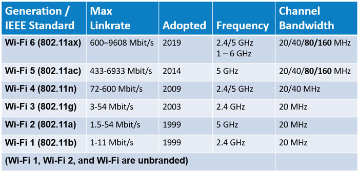 圖 1:Wi-Fi 各代標準及其對應的頻道頻寬。