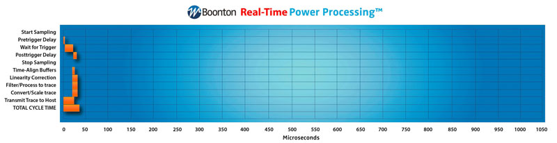即時功率感測器可以平行執行多個步驟,並且是在完整的擷取速率下進行,因此,在觸發事件發生後,無需停止擷取以等待處理階段跟上。