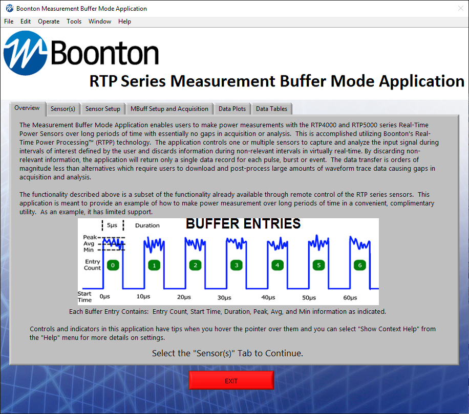 RTP 量測緩衝模式應用讓使用者能夠使用 RTP4000 或 RTP5000 系列即時功率感測器進行長時間的功率量測,擷取或分析過程中幾乎沒有間斷,這項功能是運用 Boonton 的即時功率處理™ (RTPP) 技術實現的,該應用程式控制一個或多個感測器,在使用者定義的目標區間內擷取和分析輸入訊號,並幾乎即時地捨棄非相關區間的資訊,透過捨棄非相關資訊,該應用程式將僅為每個脈衝、叢發或事件回傳單一資料記錄,資料傳輸量遠小於其他方案,那些方案要求使用者下載並後續處理大量波形追蹤資料,從而導致擷取和分析過程中的間斷。