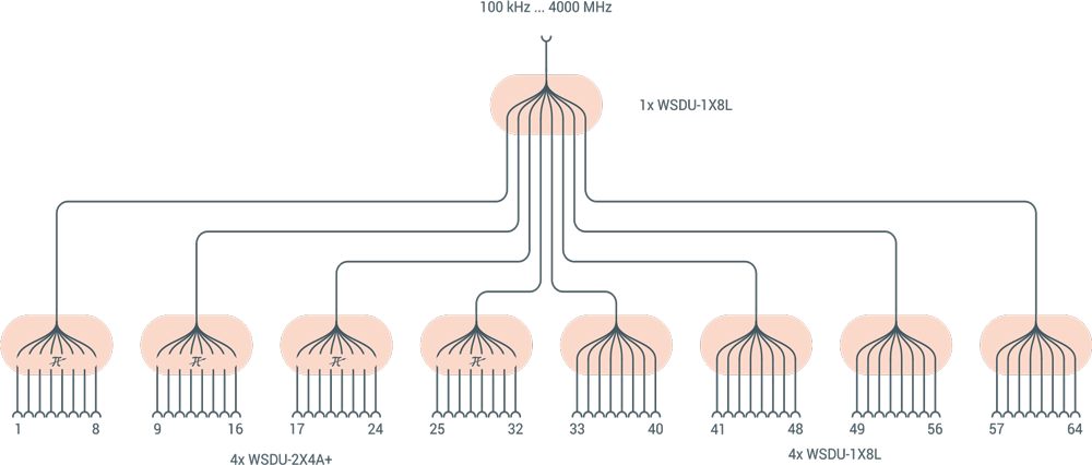 4 組天線輸入透過 WSDU-2X4E+ 主動多耦合器模組,可等電平分配至 8 組輸出埠,不產生訊號損失;每一組接收端輸出則配置 RSWU-2SP4TS+ SP8T 射頻開關模組,可在任一輸入天線間靈活切換,實現真正非阻斷式訊號選擇。