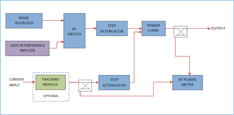CNG-EbNo 採用 替代校準法 來精確設定 載波雜訊比(C/N),此方法能消除量測設備(本例為功率計)的非線性影響;具體而言,該方法透過將 訊號與雜訊調整至相同功率水準 來進行校準(請參閱功能方塊圖),然後,雜訊功率會根據所需比率進行調整。