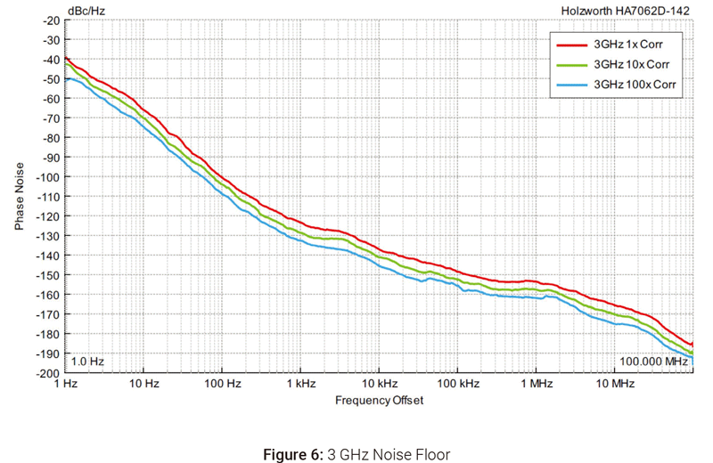 HA7062D 在五個不同頻率(10 MHz、100 MHz、1 GHz、3 GHz 和 6 GHz)範圍內的底層雜訊量測結果,每個圖表包含 1x、10x 及 100x 交叉相關量測的實際資料;值得注意的是,由於每台分析儀的底層相位雜訊略有不同,因此能夠量測分析儀的真實底層雜訊至關重要;此外,透過增加交叉相關次數,可進一步改善底層雜訊表現。