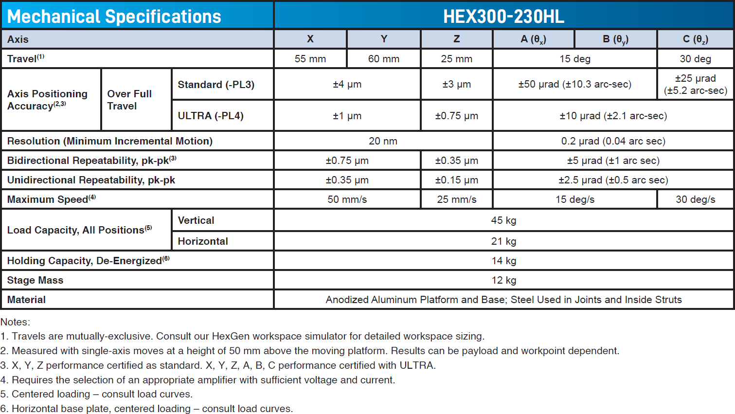 HEX300-230HL 採用六組高精度支桿驅動,每組均由高精密預載軸承、滾珠螺桿、與驅動元件組成,與傳統 DC 有刷伺服馬達的競爭產品不同,HEX300-230HL 採用 AC 無刷無槽 (slotless) 伺服馬達,大幅提升設備壽命與運行性能,透過將 AC 無刷伺服馬達直接耦合至滾珠螺桿,其剛性與定位精度顯著提高,並可實現更精細的最小增量運動 (XYZ 方向 20 nm,θxθyθz 方向 0.2 µrad);此外,專門設計的支桿關節降低摩擦,提升整體系統剛性,進一步增強 Hexapod 的穩定度與動態性能。