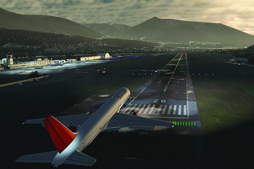 圖中為飛機在夜間進場降落,跑道燈光指引著飛行路徑,背景為山脈與城市燈光,營造出真實的模擬飛行環境,展現高擬真的燈光與環境渲染效果。