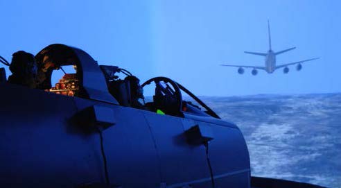 圖片中為飛行模擬訓練環境,前景是模擬飛行座艙,內部儀表與控制設備可見,背景則顯示一架飛機飛行於視野內;藍色調的場景與地形為夜間飛行訓練或戰術模擬的一部分,適用於軍事或民航飛行員的培訓,確保高擬真度的操作體驗。