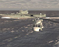 圖中為一架直升機在海上飛行,背景是一艘軍艦,海面呈現動態波浪效果,該場景來自海上作戰模擬或飛行訓練系統,用於模擬直升機在艦船附近的操作,強調環境光影與水面擾動的擬真度。MANTIS 進階海洋外掛模組
