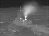 圖中為紅外線感測器模擬,可見軍艦的熱源與煙霧在紅外線成像模式下的視覺效果,展現不同材質與熱影像特徵的對比,此效果來自 MANTIS ViXsen 外掛模組,支援夜視設備(NVG) 與 短/中/長波紅外線感測器(IR Sensors),並可模擬 材質編碼資料庫及日夜變化,適用於軍事模擬、偵察訓練與感測器模擬,提供高擬真的感測器視覺效果。MANTIS ViXsen 外掛模組(MANTIS ViXsen Plug-In)