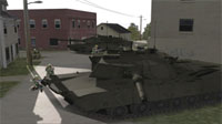 圖中為城市戰鬥模擬場景,可見坦克與步兵在巷戰環境中行動,呈現高度擬真的人員與載具互動,此效果來自 MANTIS Di-Guy,採用 Boston Dynamics Di-Guy 技術,可產生高擬真的人類與動物動畫,支援行走、奔跑、戰術動作與互動行為,適用於軍事模擬、戰場訓練與行為模擬,增強模擬環境的真實感與行動多樣性。MANTIS Di-Guy™ 外掛模組(MANTIS Di-Guy™ Plug-In)