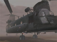 圖中為一架軍用運輸直升機(如 CH-47 Chinook) 在沙地環境中降落,旋翼氣流擾動(Rotorwash)捲起沙塵,營造高擬真的飛行動態與環境互動效果,此場景來自 MANTIS Di-Guy 外掛模組,透過 Boston Dynamics Di-Guy 技術產生高擬真的人員動畫與環境互動,適用於軍事模擬、戰場訓練與行為模擬,提供更逼真的戰術行動與降落場景模擬。MANTIS 旋翼氣流擾動效應外掛模組(MANTIS Rotorwash Plug-In)