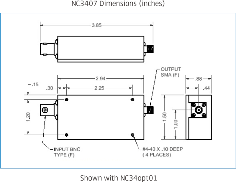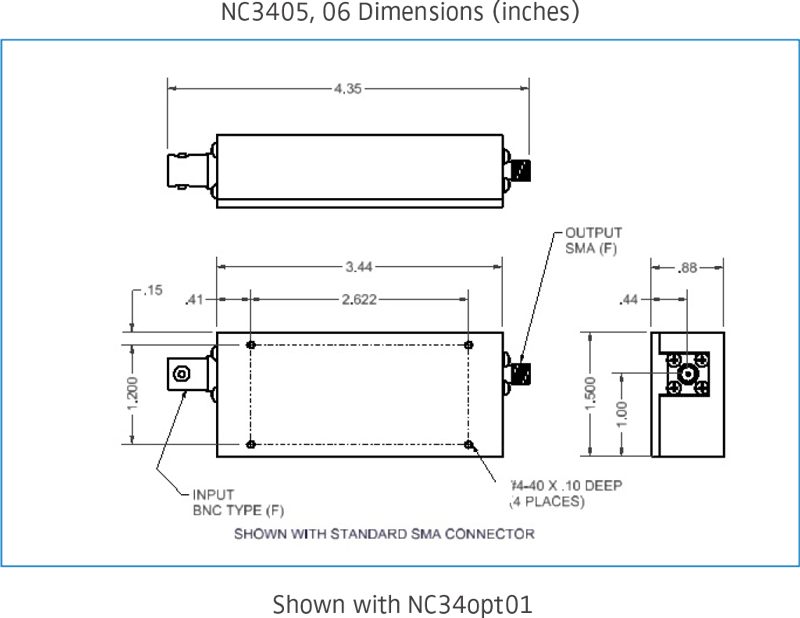NC3400 系列標準 RF 輸出介面採用 SMA(母頭),標準偏壓輸入介面為 BNC(母頭),亦可根據需求選擇其他連接器規格,以滿足不同應用環境的需求。