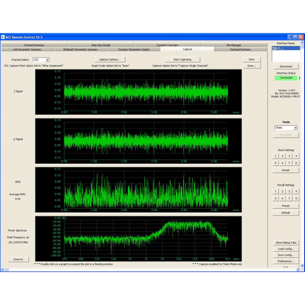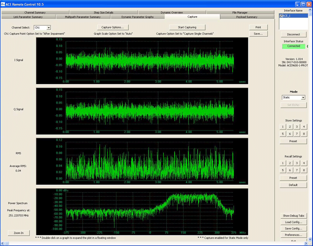 ACE Remote Control 的訊號擷取 (Capture) 介面,用於監測並分析 I/Q 訊號、均方根值 (RMS) 及功率頻譜 (Power Spectrum),介面顯示通道 1 (Ch1) 在訊號劣化之後的擷取結果,並提供即時視覺化波形分析;右側面板允許使用者設定靜態模式 (Static Mode),並存取或調用預設測試配置,確保測試環境的可重現性。