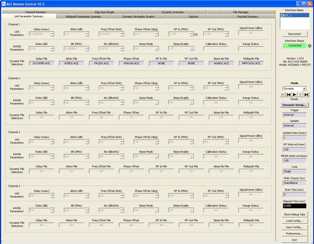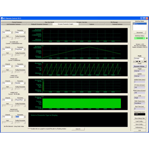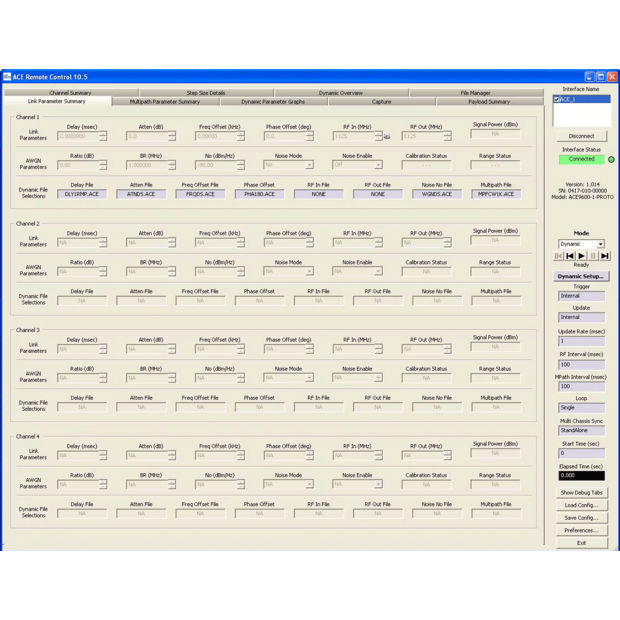 進階通道模擬器 (Advanced Channel Emulator, ACE) 終端控制軟體是一款功能全面的應用程式,專為遠端控制 ACE 衛星與無線通訊通道模擬器而設計;此應用程式能夠讓使用者透過直覺化的圖形介面操作,對所有 ACE模擬器 功能進行精確的遠端控制,無需直接接觸硬體設備即可管理與調整各種通道模擬參數。