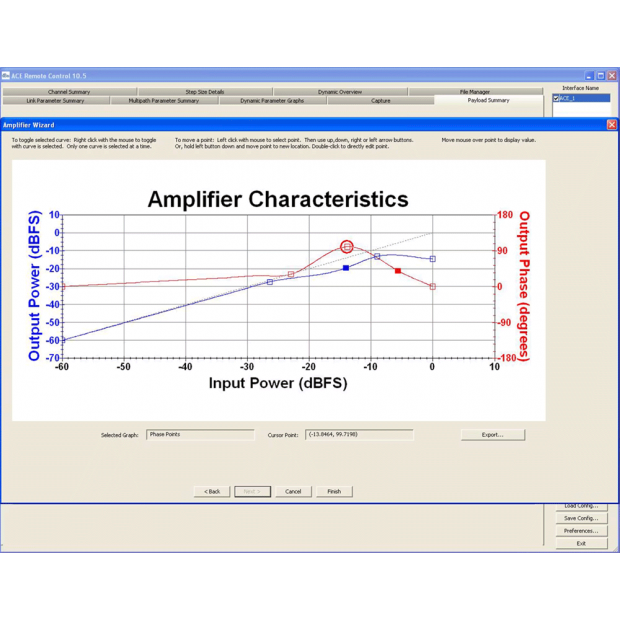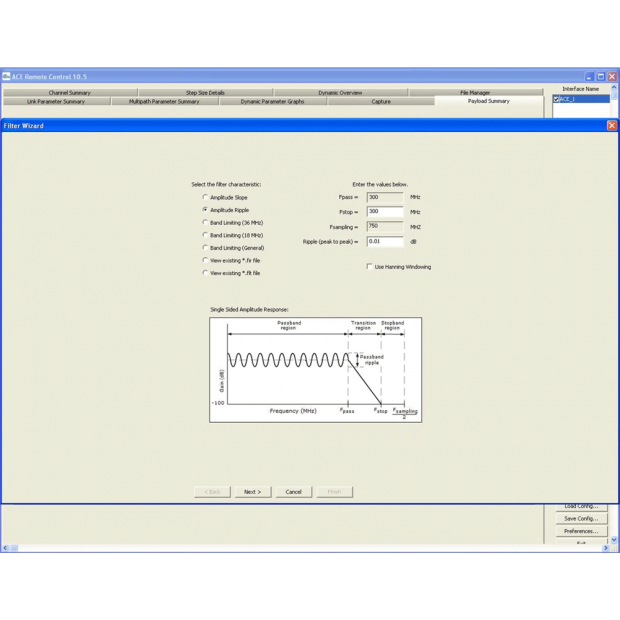 下圖為 ACE Client軟體 的強大且直覺的圖形介面,幫助使用者精確控制ACE9600通道模擬器,並進行詳細的訊號分析,從訊號擷取、濾波器響應設計、相位雜訊測試到放大器特性分析,ACE Client 能夠模擬多種通訊環境中的非理想效應,確保測試結果的可靠性與可再現性。