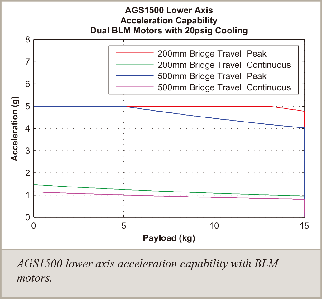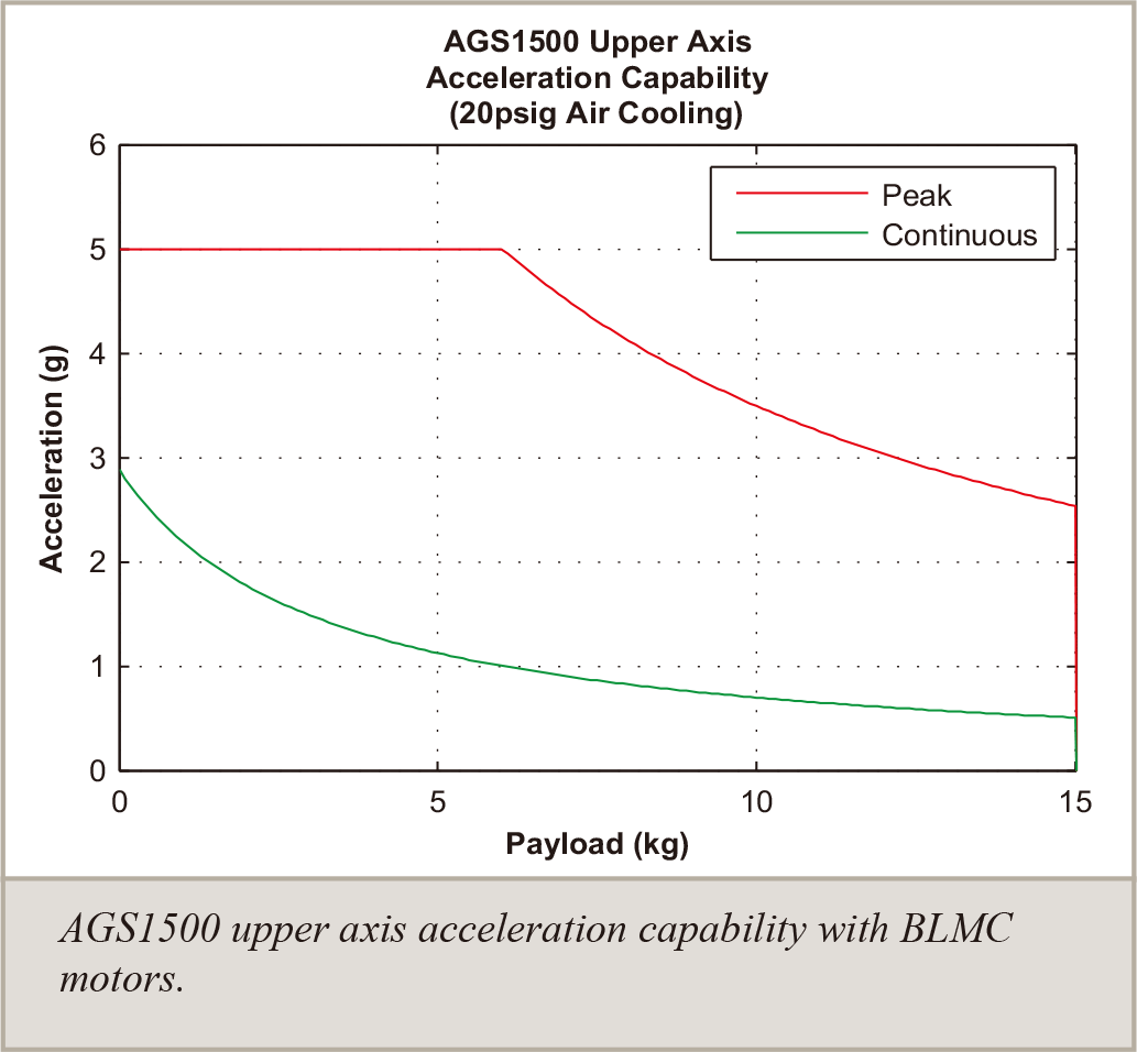 圖中為 BLMC 馬達在 20 psig 空氣冷卻下,AGS1500 上軸的加速度性能;峰值 (Peak) 和連續運行 (Continuous) 狀態下的加速度隨負載增加呈下降趨勢,其中峰值加速度最高達 5 g,隨著負載增加逐漸降低。