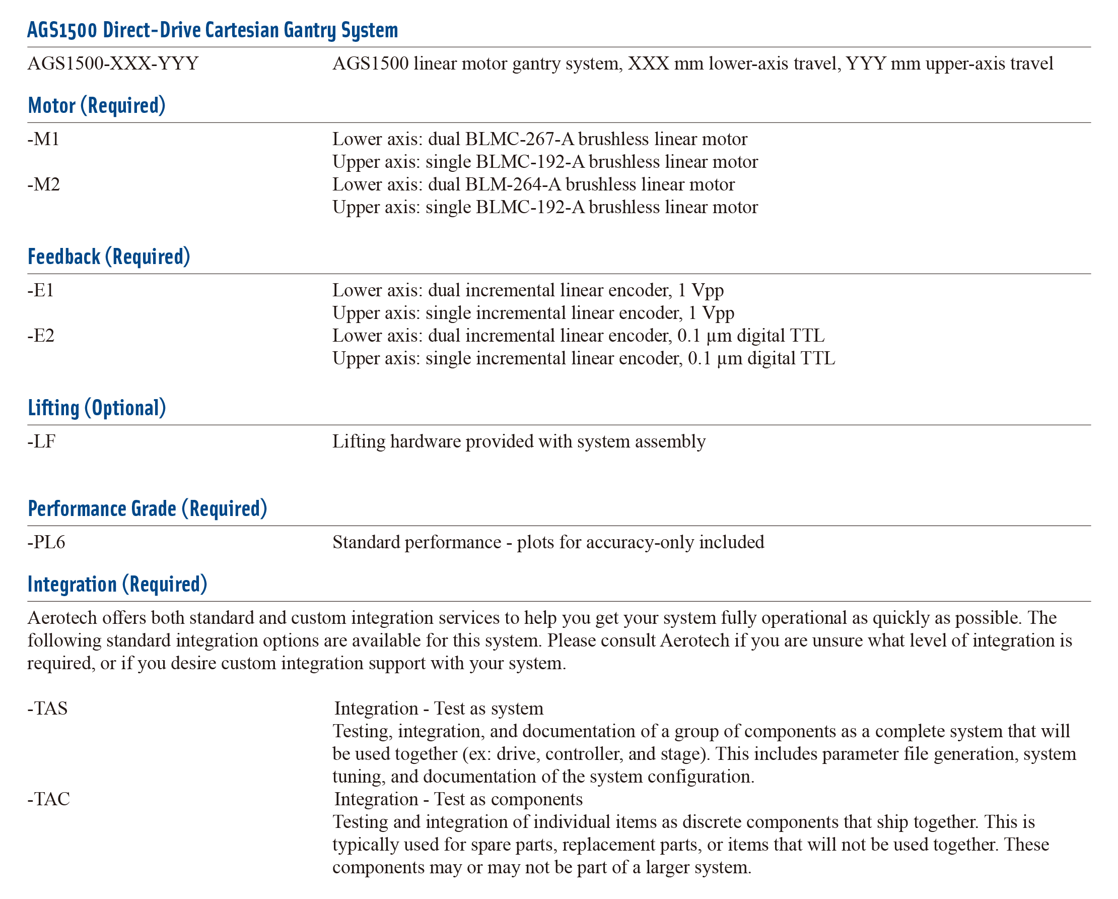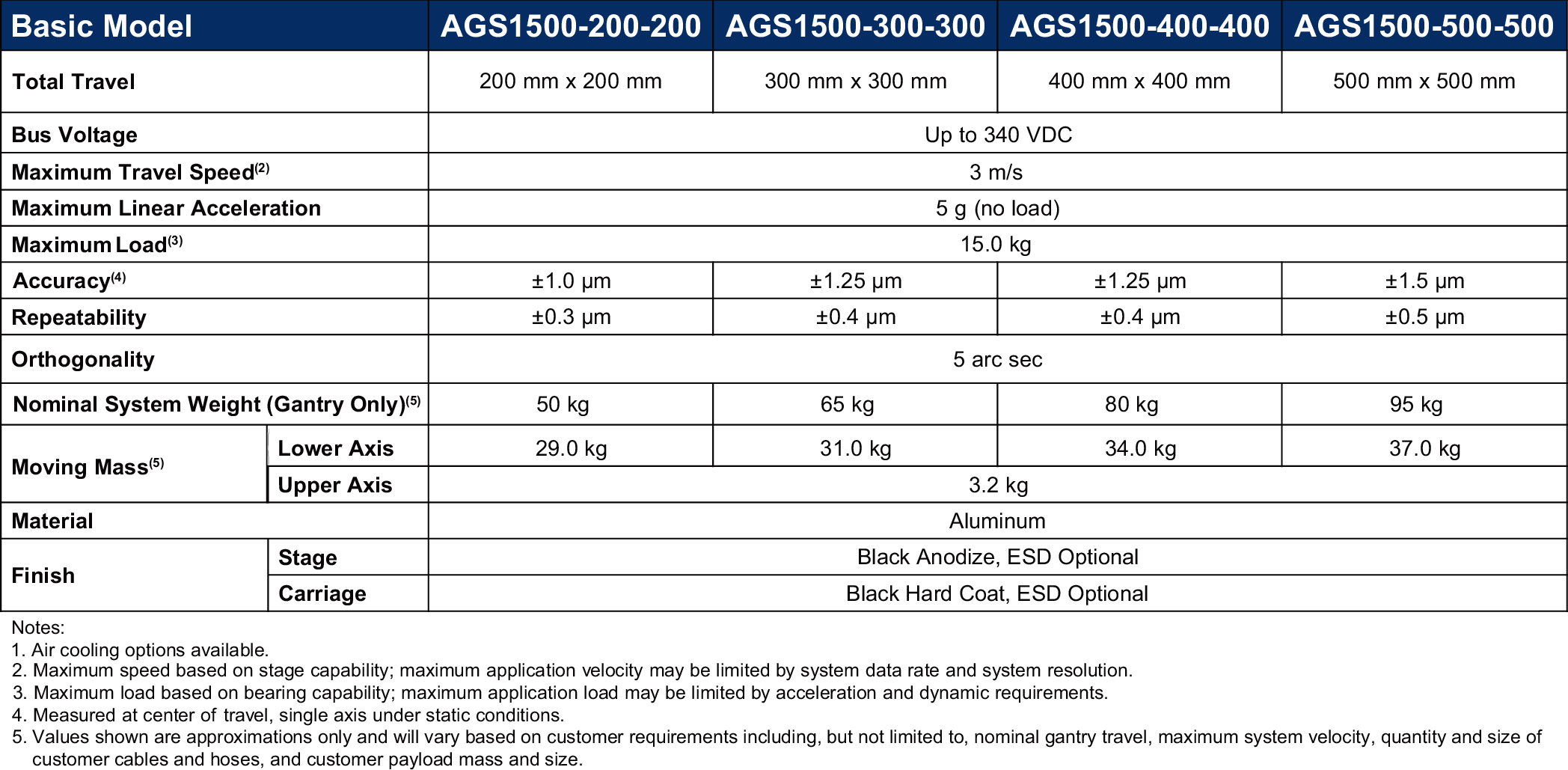AGS1500 採用了 Aerotech 高性能的 BLMC 與 BLM 系列無刷線性伺服馬達 (Brushless Linear Servomotors),讓機台能夠達到 3 公尺/秒 (m/s) 的高速運作,並實現高達 5 g 的加速度;下軸配置了雙線性馬達與編碼器 (Encoders),確保運行時的極致穩定與高精度;搭配 Aerotech 控制器使用時,耐用的非接觸式光學線性編碼器 (Noncontact Optical Linear Encoders) 更可提供達 1 奈米 (nm) 的超高解析度。