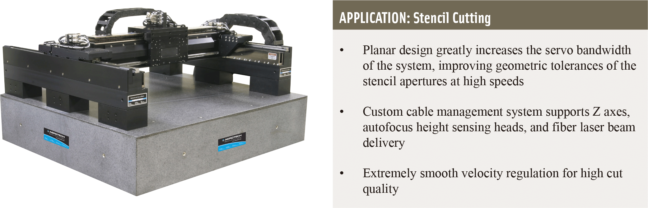 - 平面設計搭配雙線性馬達/編碼器與堅固的安裝介面,實現高速切割下的微米級動態精度