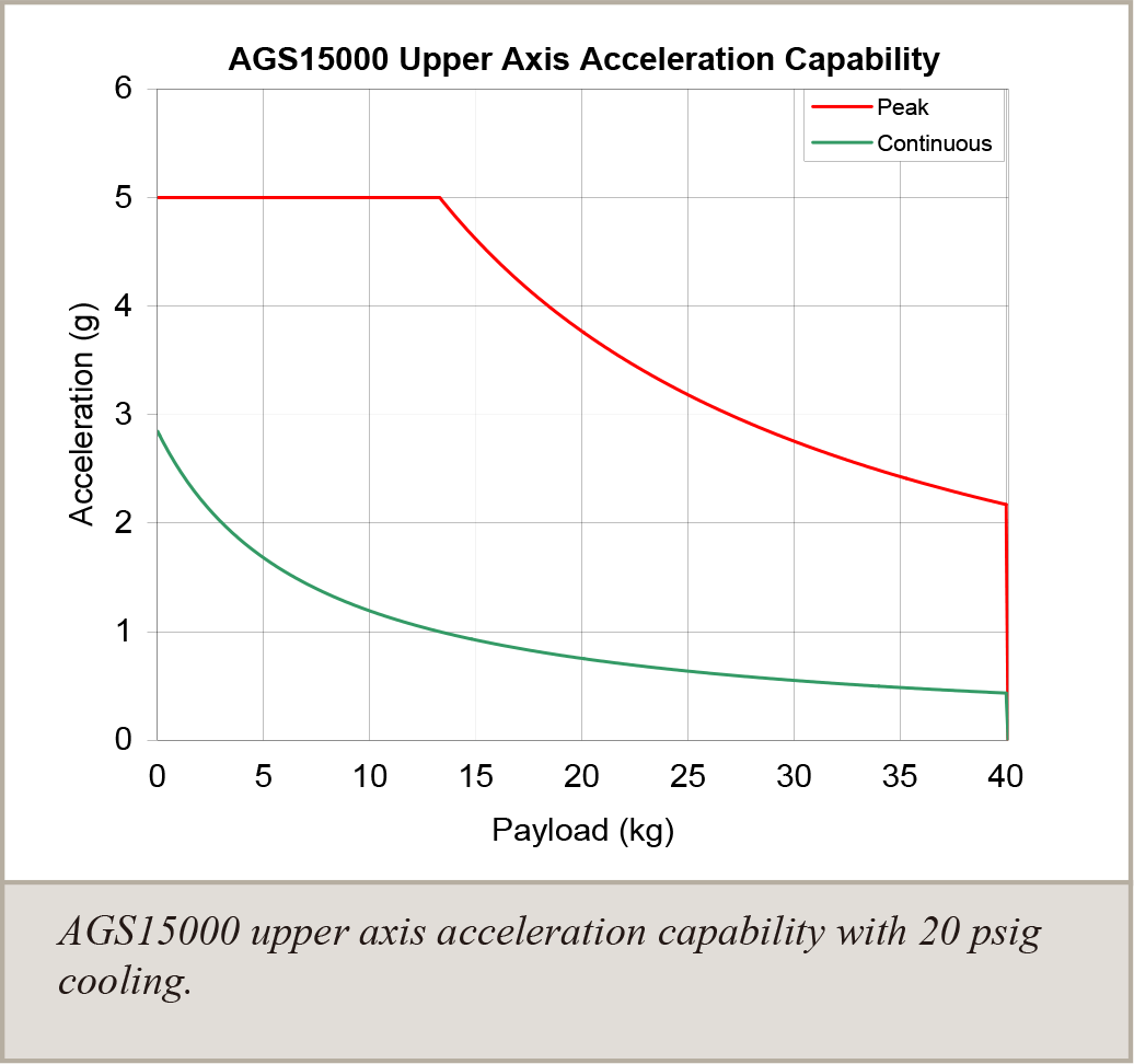 該圖顯示 AGS15000 上軸在 20 psig 冷卻條件下的加速度能力,包括峰值與連續運行的對比,呈現負載變化對加速度的影響。