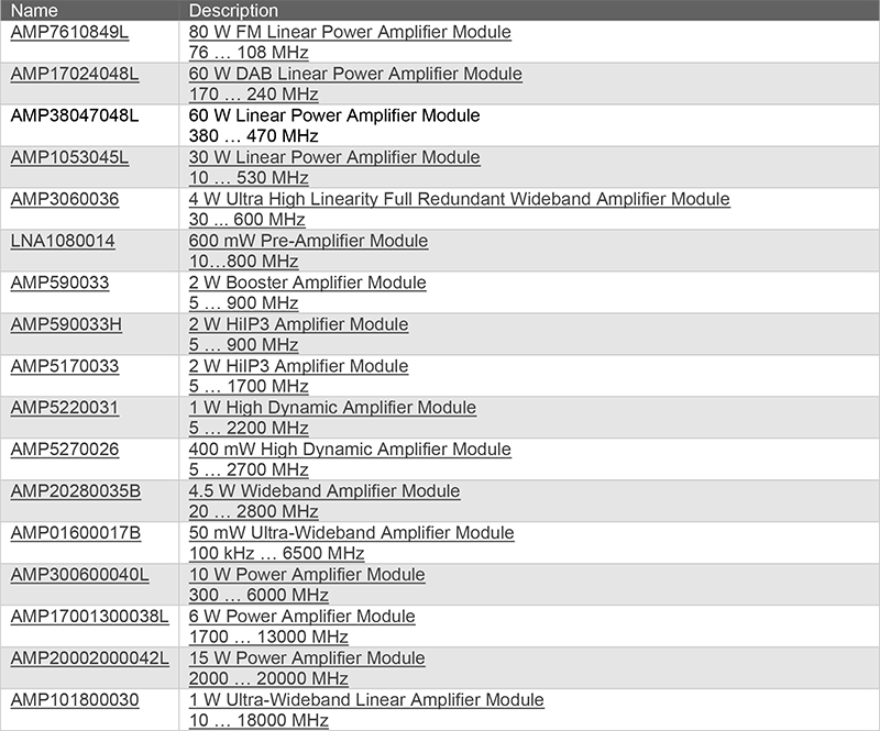 Becker 提供完整且多樣化的 AMP 放大器模組選項,可直接整合於 AMP-LR 機架式機箱中,支援不同頻段與輸出功率等級之應用需求。更多模組規格與選型細節,請參閱下方訂購指南。