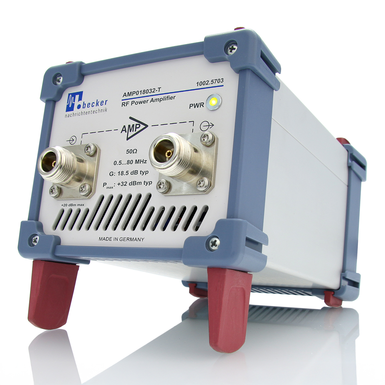 AMP018032-T 為 Becker 推出的高線性桌上型放大器,採用 50 Ohm 技術,專為實驗室環境與高精度量測應用設計;具備寬頻操作、堅固機構設計與高穩定性輸出特性,能支援涵蓋多倍頻段的射頻處理需求;該機種支援寬範圍 AC 主電源輸入,前面板設有電源狀態 LED 指示燈,標配安裝腳座,便於工作台整合與長時間連續操作。
