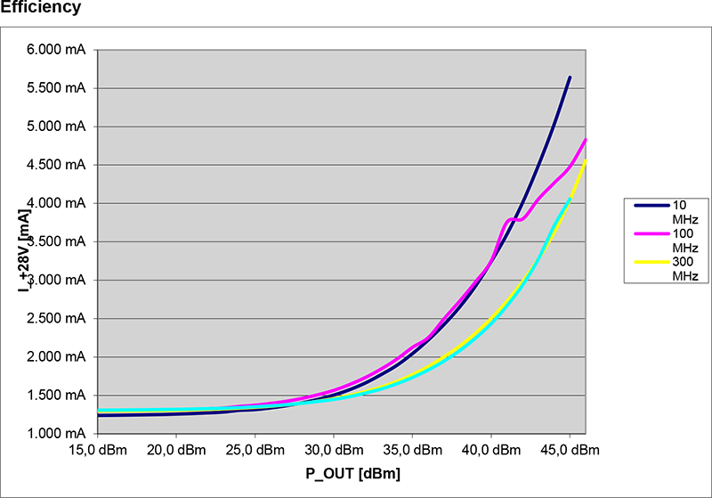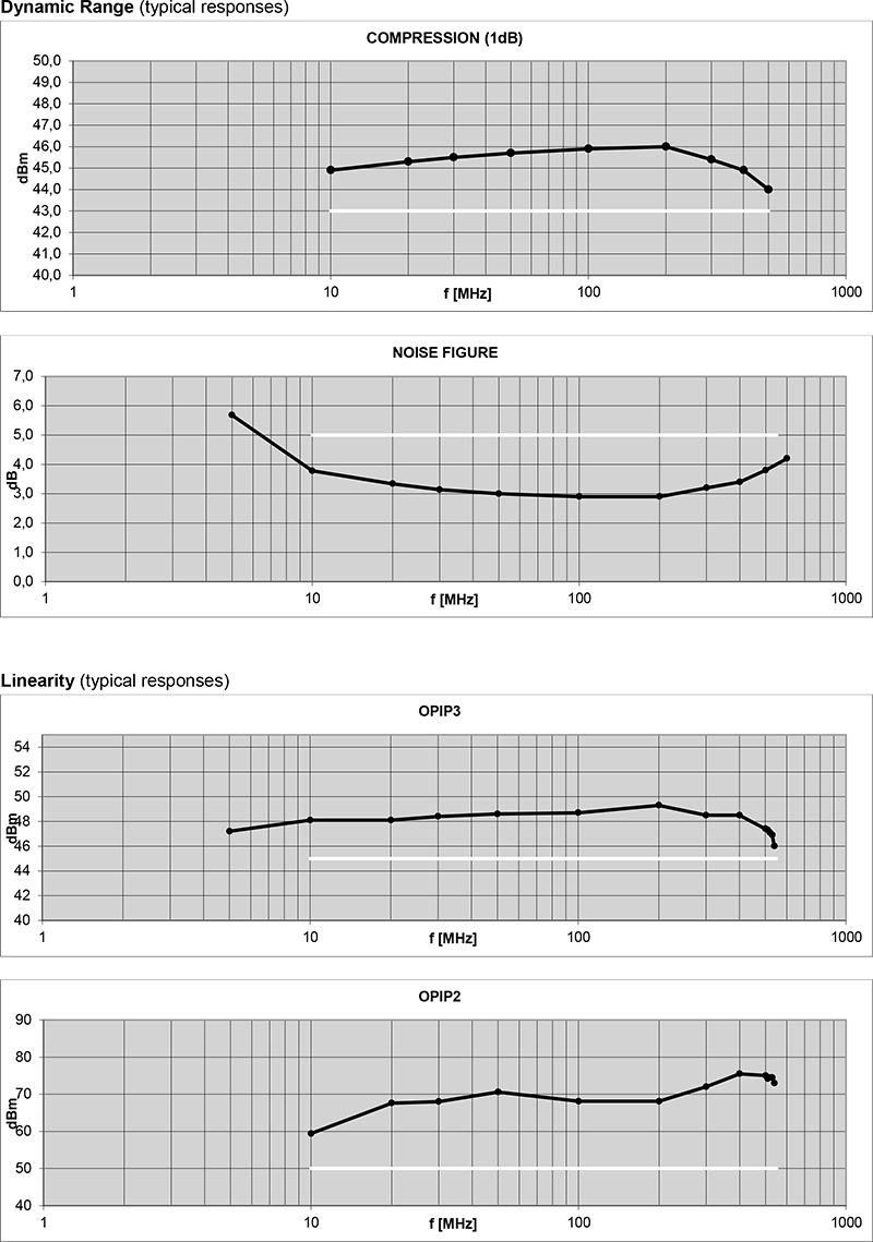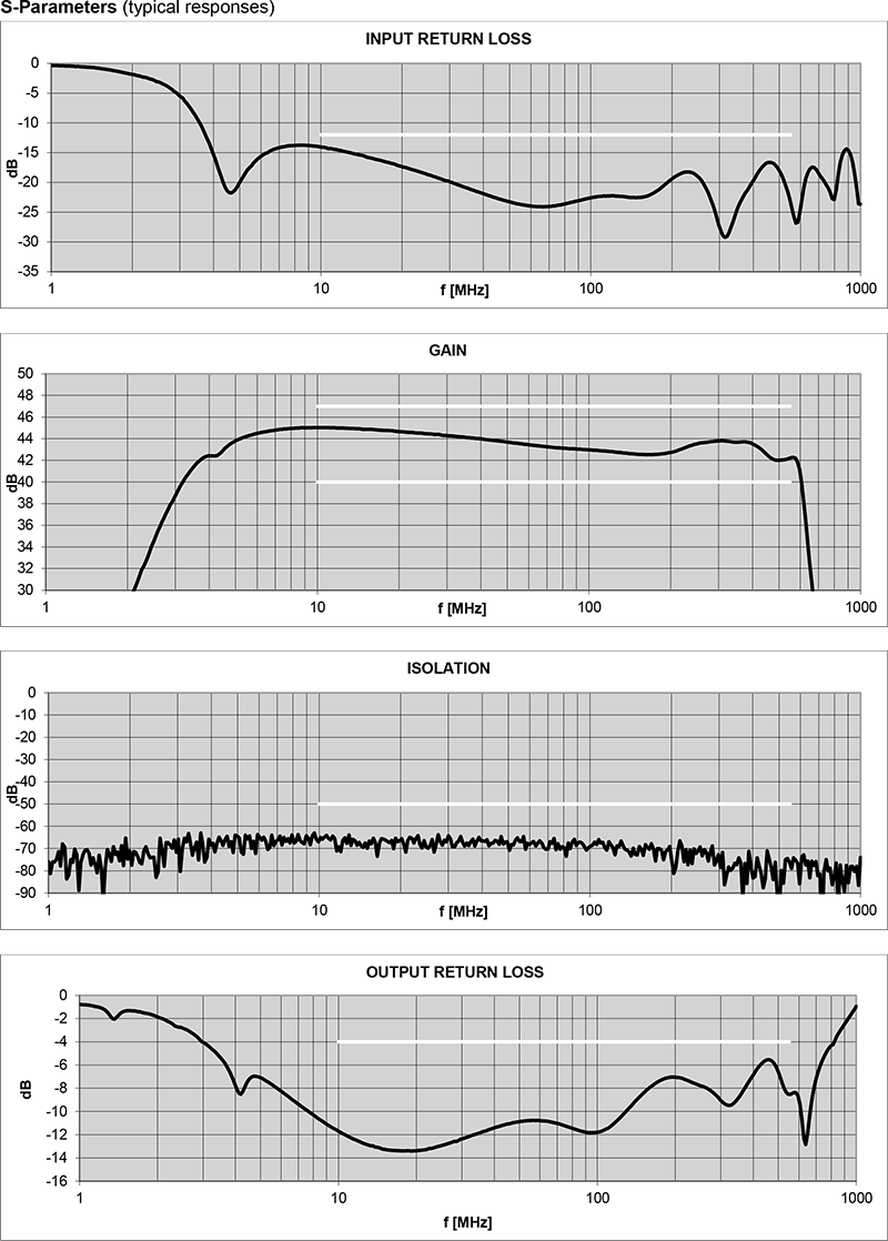 - 高三階交調點(OIP3)+49 dBm,適用於高線性需求之數位調變訊號放大