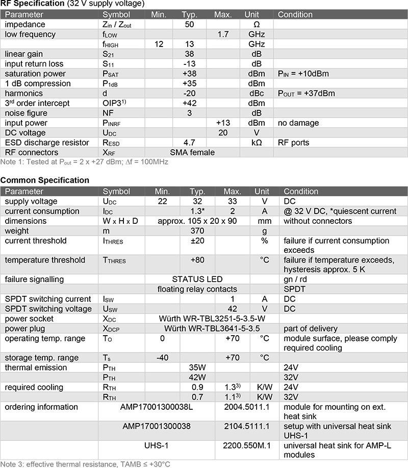 為避免安裝時因電源接錯而導致損壞,模組內建反向極性保護機制,大幅提升使用安全性與可靠性;模組運作狀態與電源供應情形,皆可透過LED 指示燈即時顯示,並支援浮動式繼電器接點輸出,供遠端系統查詢模組健康狀態;該放大器模組需安裝於由使用者提供的散熱器上進行被動冷卻,亦可選配相容之通用型散熱器 UHS-1,以簡化整合與安裝流程。