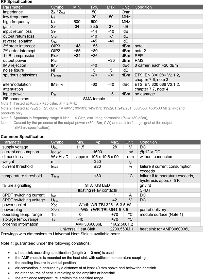 AMP3060036L 適用於各類無線通訊系統,可作為發射端放大器使用,並符合歐盟 RED 指令 2014/53/EU 下之 ETSI EN 300 086 V2.1.2 規範,具備對雜散訊號與互調干擾的優異抗擾能力,滿足專業通訊設備之嚴格要求。