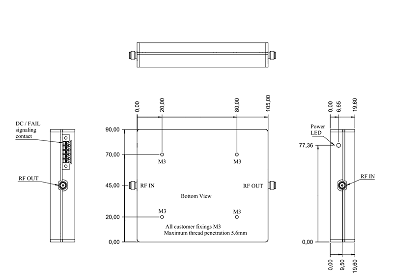 內部整合高效濾波器與低雜訊穩壓供電電路,有效抑制雜散訊號(spurious signal),提升輸出訊號純度,電源供應具備反極性保護設計,避免安裝錯誤造成損壞;同時支援寬範圍直流電壓輸入,應用彈性更高。模組外殼設有 LED 指示燈,可清楚顯示電源狀態與模組運行狀態;此模組設計為外部散熱器安裝型,可由使用者依應用需求搭配合適散熱方案。