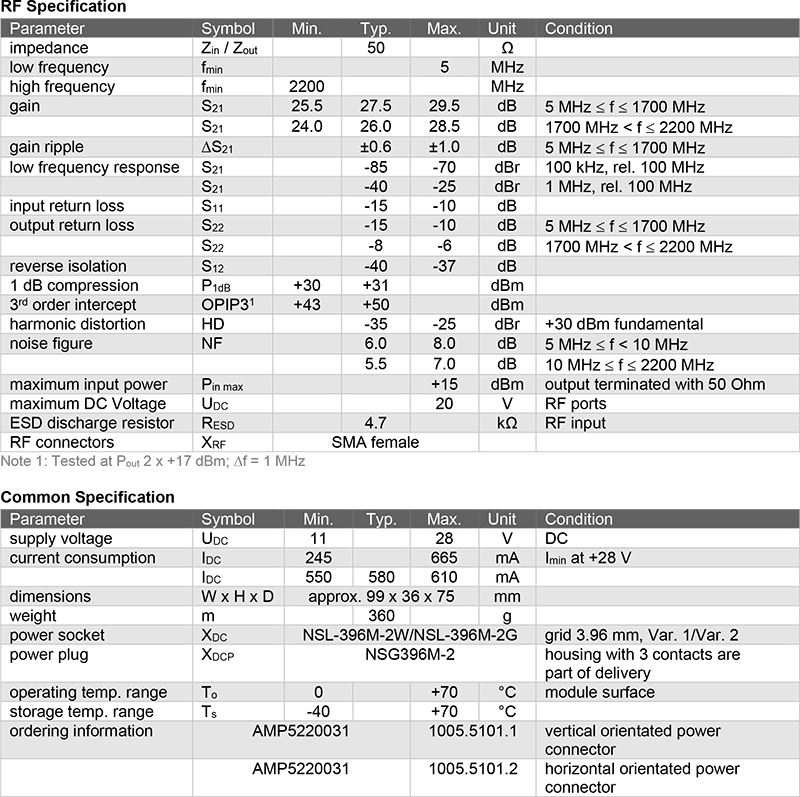 AMP5220031 高動態放大器模組 (1W, 5~2200 MHz)