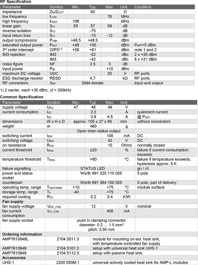 AMP7610849L 為 Becker 所推出之小型化放大器模組,專為專業 FM 廣播與 IBOC(In-Band On-Channel)數位廣播應用而設計。
