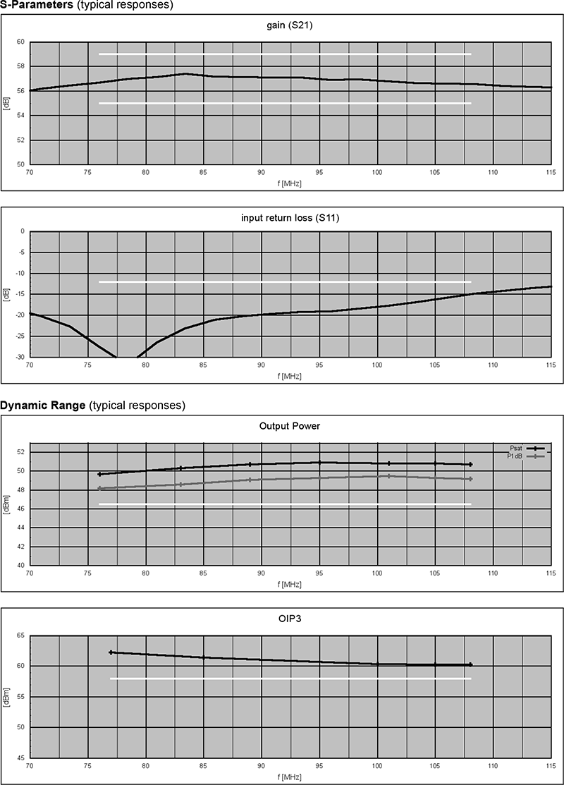 高 IP3 特性(第三階互調指標)使此放大器模組適用於需放大數位調變訊號與多載波訊號等專業應用,能有效避免失真效應;模組內建自我監測功能,可即時監控電流消耗與模組溫度;當超過安全限制時,會啟動開漏輸出(Open Drain)以通知使用者,並透過模組上的 LED 燈顯示狀態變化。