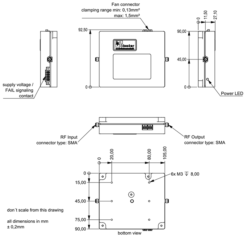此機種具備堅固的電氣與機械結構設計,可長時間穩定運作;內建濾波器與低雜訊直流供電電路,具備優異的雜散訊號(spurious signal)抑制能力。為避免安裝時發生損壞,供電具備反接保護機制;模組採用單一路直流電壓供電,並透過模組上 LED 顯示供電與模組狀態。RF 連接器為 SMA 母頭型式;此機種需安裝於外部散熱器上以維持溫度穩定;所有 AMP 系列放大器皆採用 50 Ohm 技術設計。