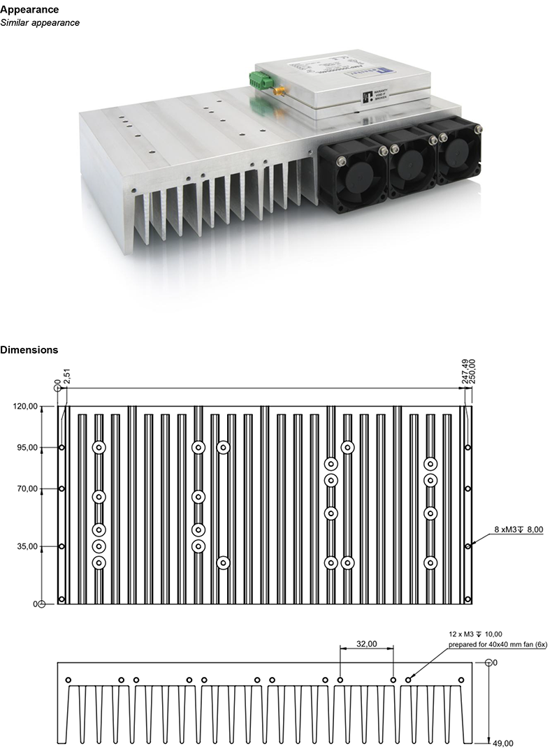 此放大器模組封裝於經 CNC 加工之鋁製機殼中,有效保護電路元件避免受損,並提供優異的電磁干擾(EMI)屏蔽效果;標準模組設計供安裝於使用者提供之散熱器上,亦可選購原廠對應散熱模組。