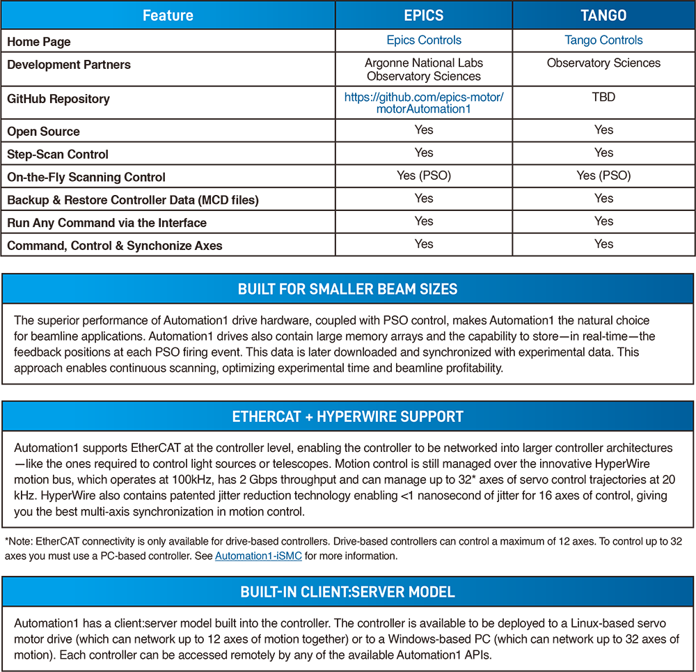 EPICS(Experimental Physics and Industrial Control System) 與 TANGO(TAco Next Generation Objects) 為使用實驗科學設施的科學家們提供了一套共通語言,而Aerotech的 Automation1 運動控制平台作為精密運動控制領域的卓越標準,其整合了新一代的 PWM(脈衝寬度調變) 與線性放大器技術、優異的配置與設定工具、絕對式編碼器支援、創新的 HyperWire 光纖運動匯流排,以及Aerotech獨特的 PSO(Position Synchronized Output,位置同步輸出) 功能,此功能可依據軸的實際位置來觸發外部事件,讓感測器觸發與位置擷取的流程變得直接而簡易。