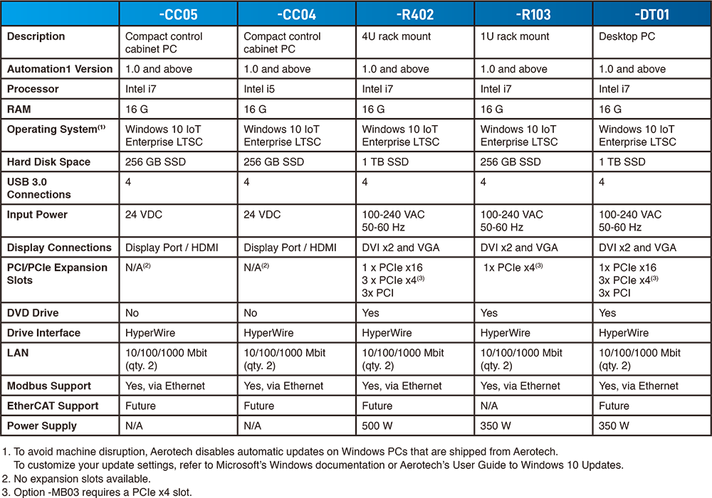 Automation1-iPC、-CC04 與 -CC05 硬體選配項目