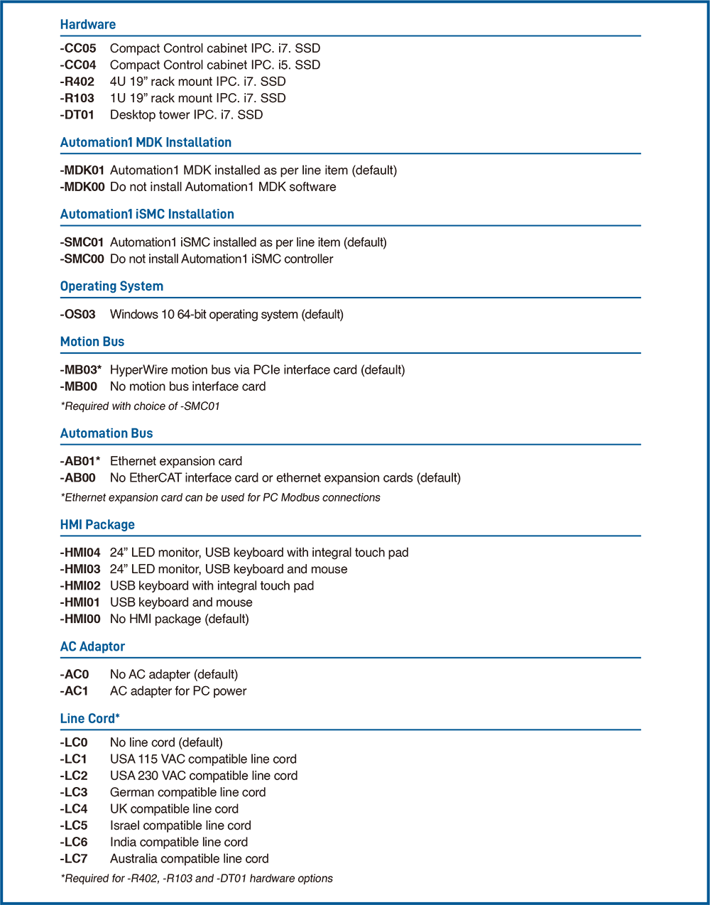 Automation1-iPC、-R402 硬體選配項目