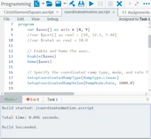 Aerotech AeroScript™ 程式設計語言將運動控制、G-code 與製程控制指令整合為單一語言,專為精密自動化應用而設計。AeroScript 具備陣列、結構、程式庫等多種現代化特性。