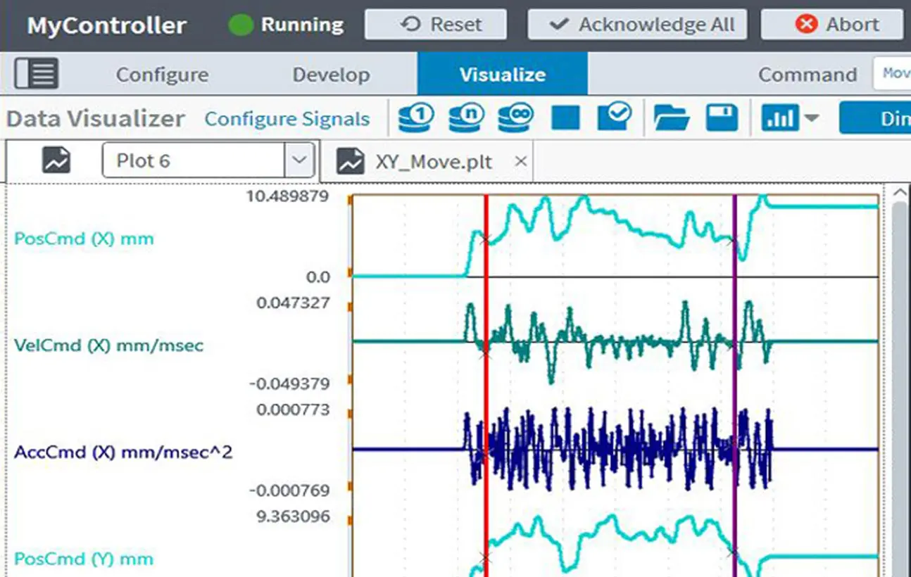 您可以使用 Data Visualizer 這款強大的數位示波器來分析設備的效能資料,它能夠存取來自控制器和驅動器的數百種訊號,並以 1D、2D 及頻域等多種方式呈現資料。您不僅能檢視來自實際馬達驅動器的回授訊號,還可以透過虛擬軸進行運動控制的系統模擬。