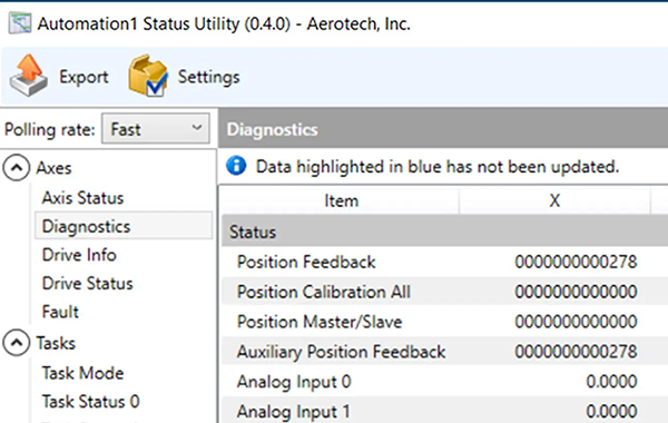 狀態監控工具程式 (Status Utility) 能提供運動系統效能的全面快照,您可以快速辨識系統、控制器、軸向與製程層級的設定、統計資料、狀態及故障資訊。