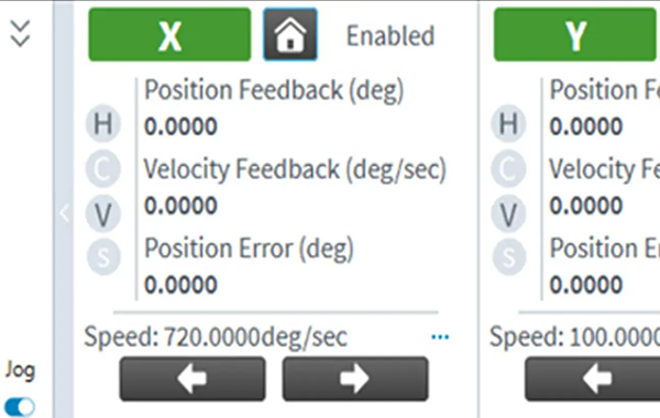 透過軸向儀表板,您可以快速啟用、復歸原點以及寸動各個軸向。為了提供最大的使用彈性,軸向儀表板包含最小化檢視、最大化檢視以及附帶寸動控制的最大化檢視模式。此儀表板的先進設計讓您能夠快速且輕易地控制實際運動或進行系統模擬。