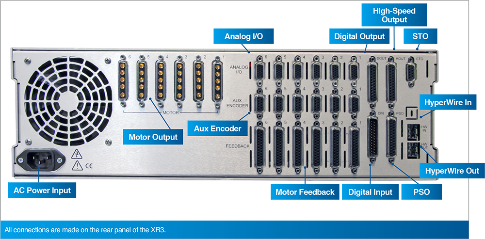 此為 Automation1 XR3 伺服驅動器機架的後方面板,所有連接埠皆集中於此,一目了然;面板上除了交流電源輸入與六組馬達輸出外,更整合了豐富的 I/O 介面,包括類比與數位訊號、輔助編碼器、高速輸出,以及用於高階同步控制的 PSO、STO 與 HyperWire 光纖通訊埠,提供全面且彈性的系統連接能力。
