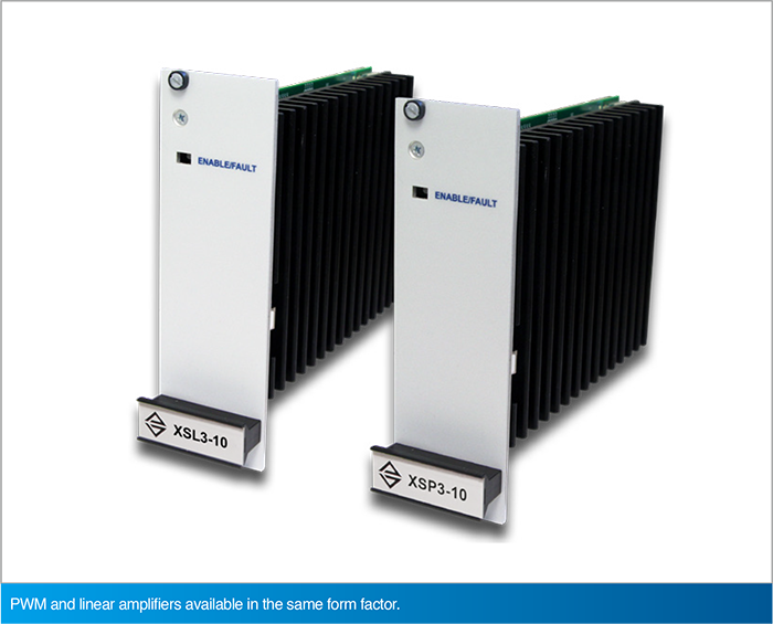 此為 Automation1 XR3 所支援的插入式放大器模組,使用者可依據應用需求,選擇 PWM (脈衝寬度調變) 或線性放大器;如圖中所示的 XSP3-10 (PWM) 與 XSL3-10 (線性) 模組,兩者採用完全相同的外型尺寸與機構設計,確保在安裝與更換時的高度便利性與互換性,提供最大的系統配置彈性。
