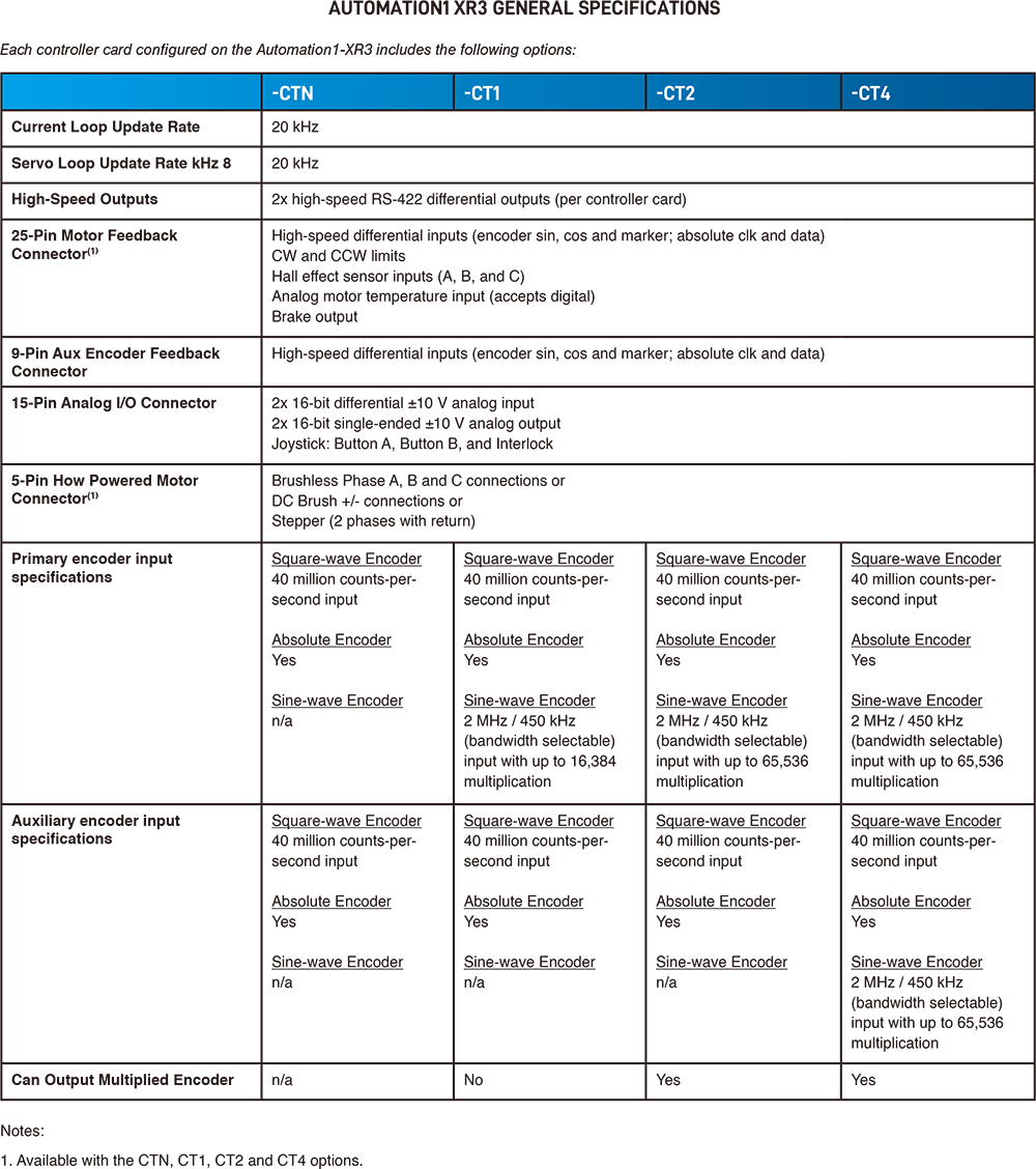 XR3 的配置選項包含三種不同等級的整合式編碼器倍頻、散熱選項、安裝選項,以及低延遲的位置同步觸發控制 (PSO) 選項。